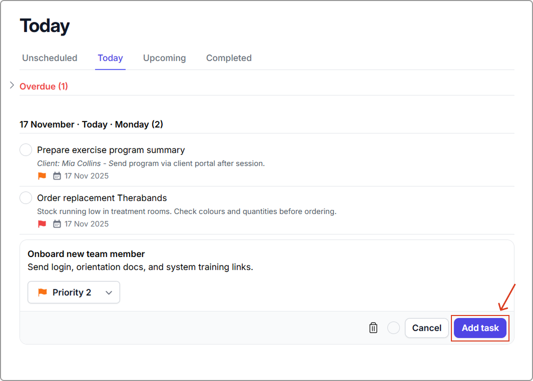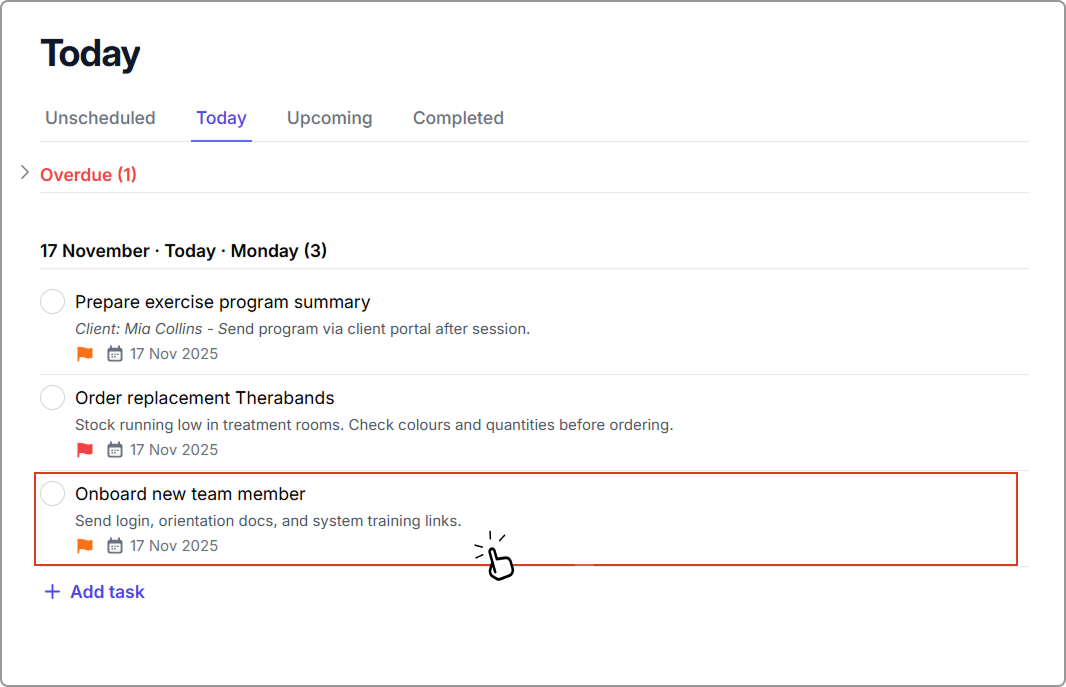 | **Today**       | <p>Lists all tasks due today, plus any overdue ones grouped above today’s list.<br>Overdue tasks display in red, with the number of days overdue.</p> |